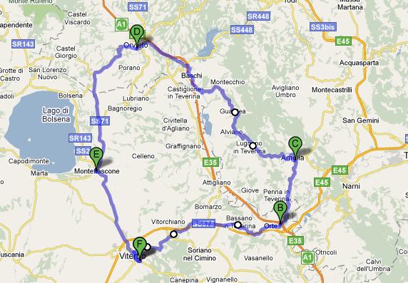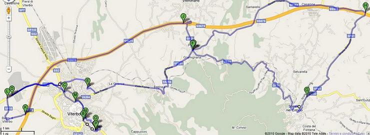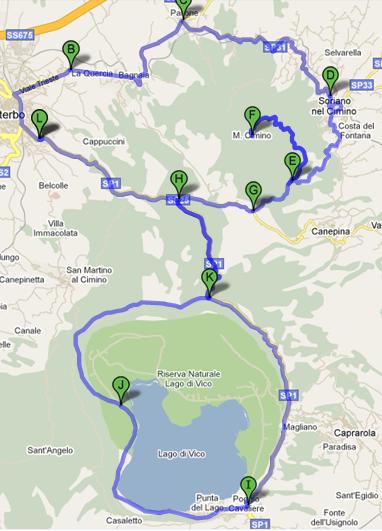 Viterbo, Strada Filante, San Martino al C., La Madonnina, Antenne, Passo montagna, Strada Romana, Bagnaia, Pallone, Soriano, Pian della Britta, Faggeta (Monte Cimino), Passo Montagna, Ronciglione, un giro del Lago di Vico, La Vite, San Martino al C., Viterbo.