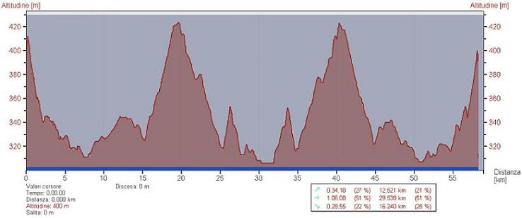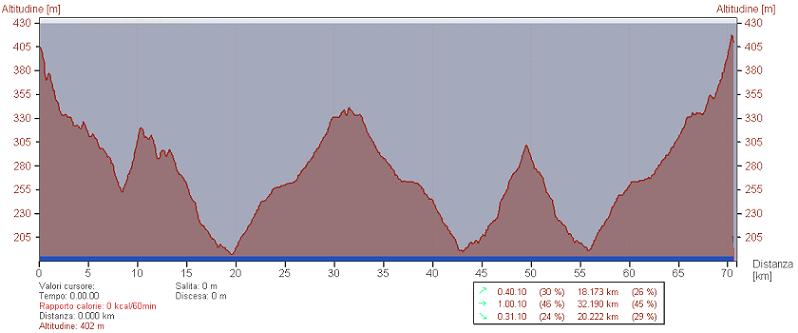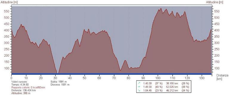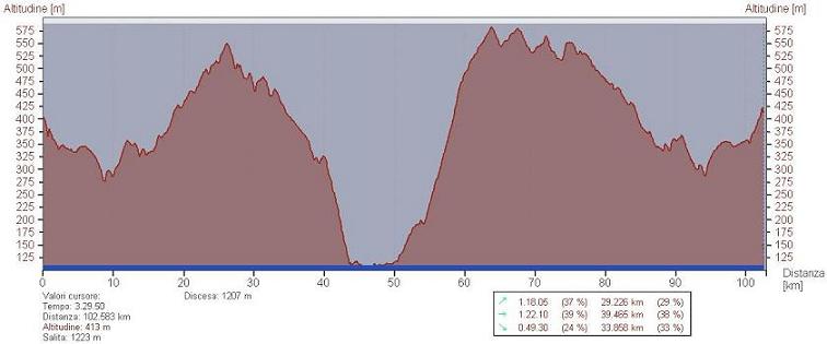 108.8 km, 4 ore e 34 min, 23.8 km/h di media, 1900 metri di dislivello.