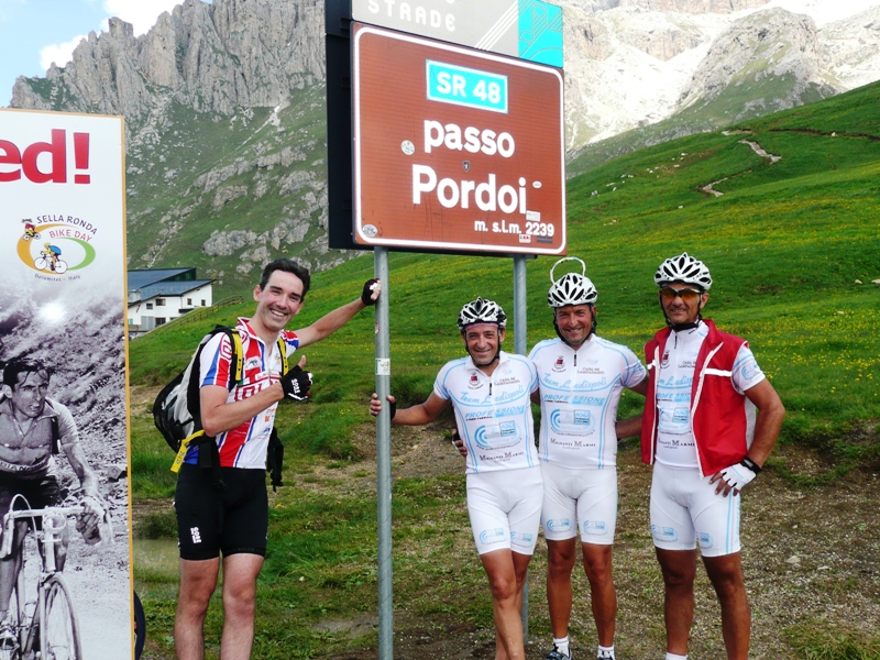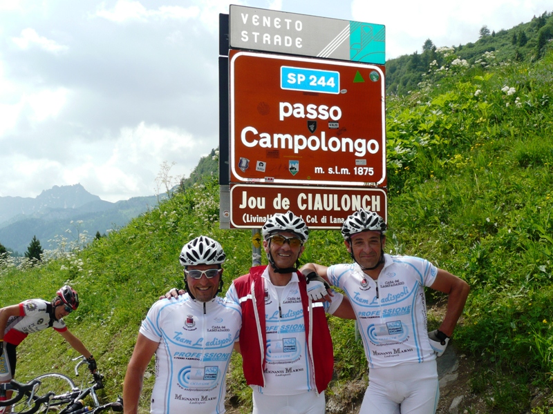 Si sale subito a canazei e da li si gira per il passo sella. Foto di ritoe via al passo gardena dove ci aspettano per la seconda foto max, aramis,grillo, il bionico e roby (ho dimenticato qualcuno). Riscendiamo verso corvara con grillo e aramis mentre roby e max proseguono per il sella ( a proposito, e il bionico?) li lasciamo ed attacchiamo il campolongo dove la presenza dei tanti ciclisti non fa sentire la stanchezza.