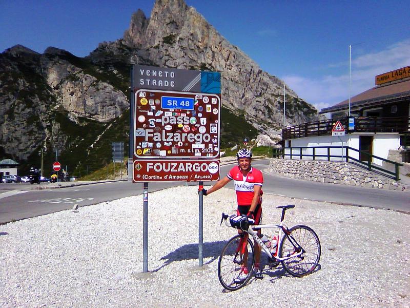 Il Falzarego è una passeggiata (anche perché non vengo dalla Maratona delle Dolomiti!) concluso col la foto di rito elemosinata ad un altro ciclista, altro caffè e via a Livinallongo dove mi trasformo in Teamax e attacco un trenino ai 35 all’ora (aho!, è salita) tirandomi sei ciclisti raccolti lungo il percorso.