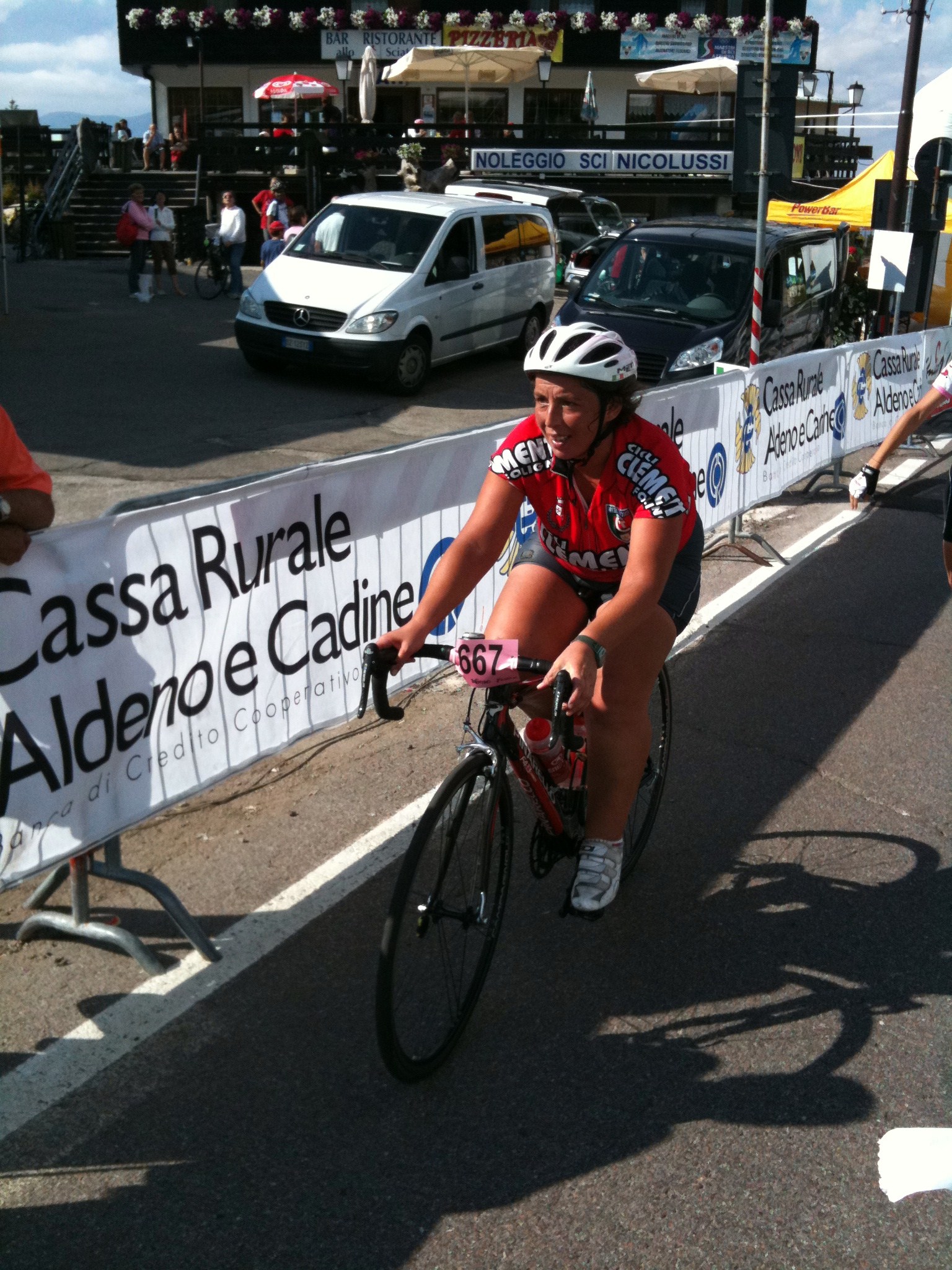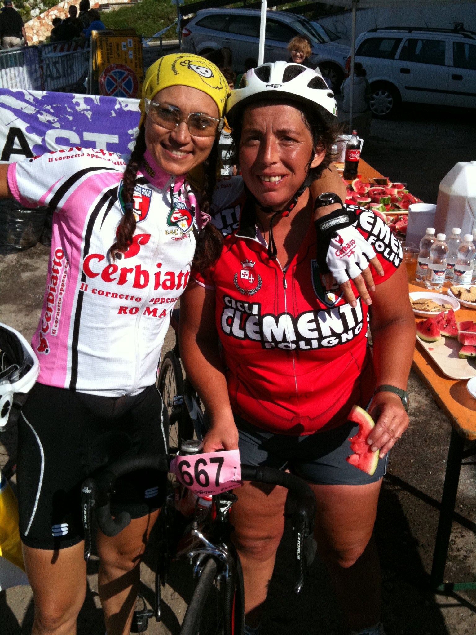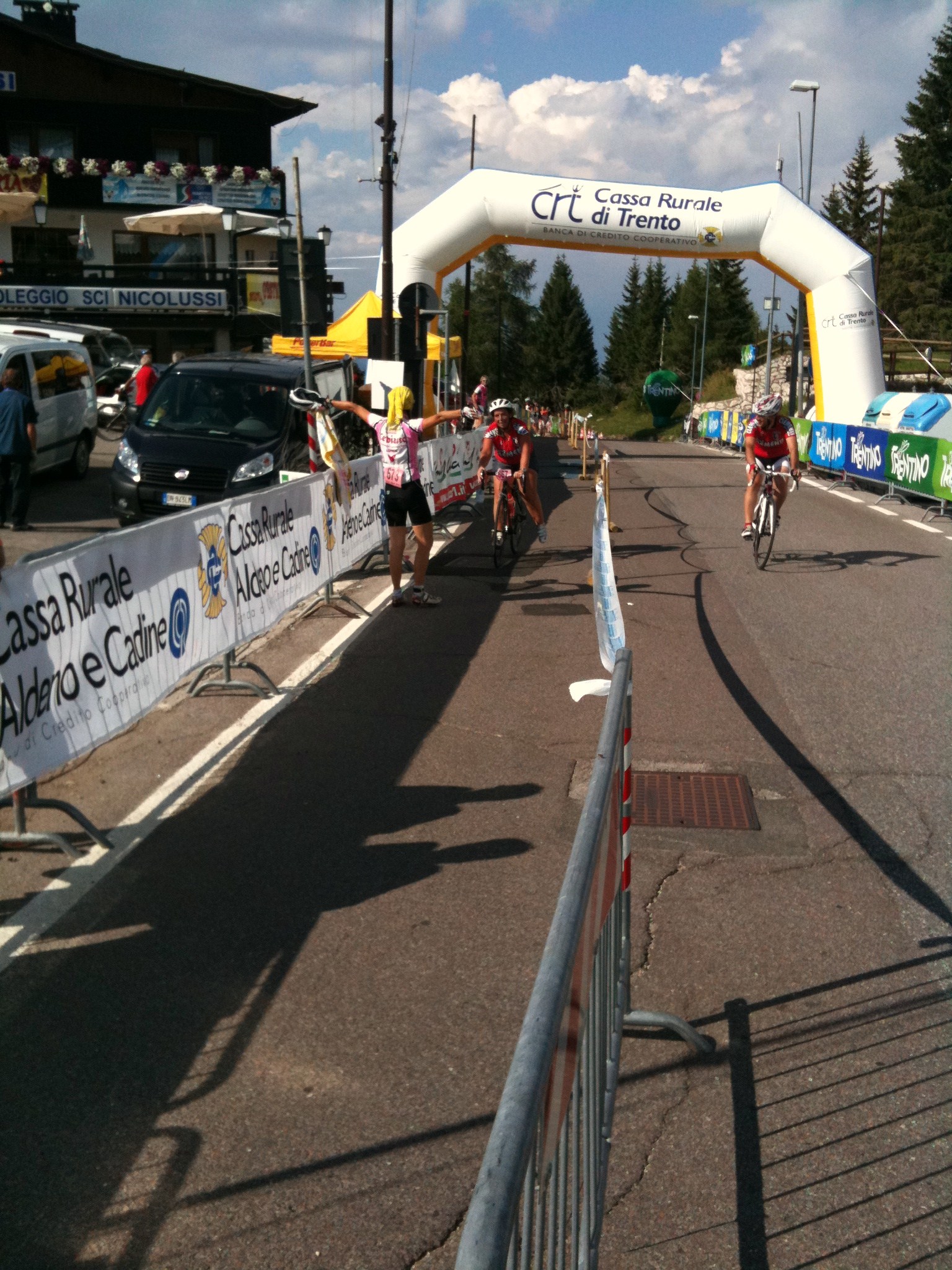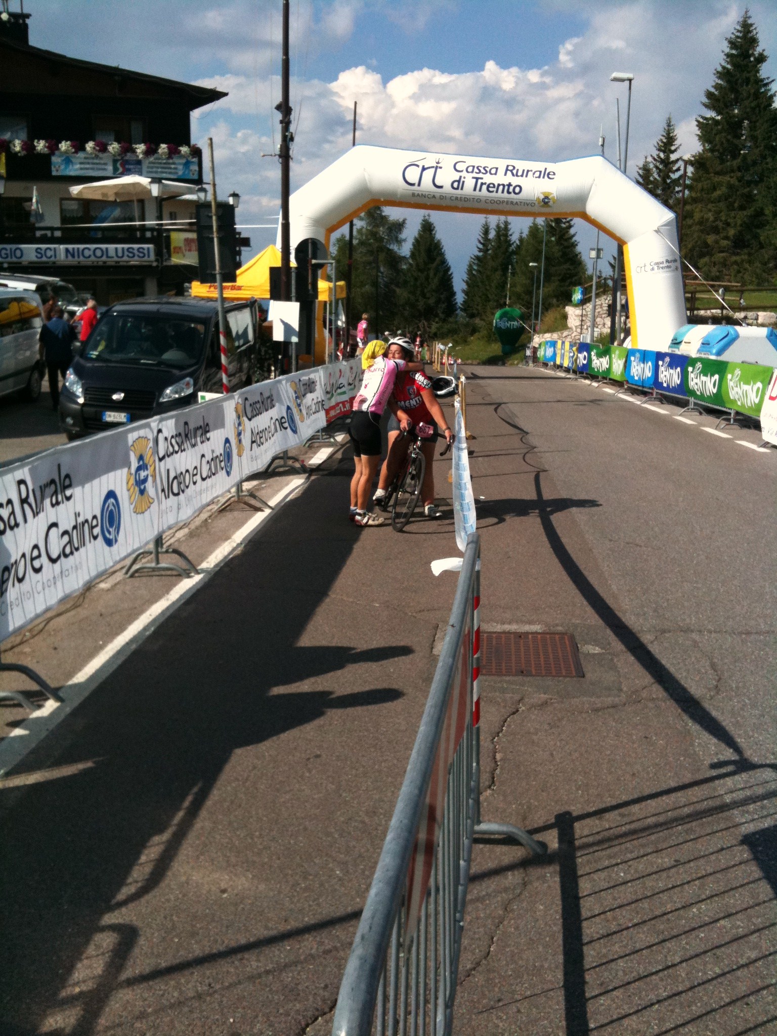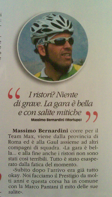 Domenica dopo la colazione delle 7 abbiamo raggiunto le griglie lungo i 7km della ciclabile e tutti insieme fianco fianco siamo partiti alle 8.35 da piazza del duomo nel centro di Trento Primi 46km velocissimi, siamo riusciti bene o male ad essere uniti a 40 di media Poi ad Aldeno inziava la prima delle 2 salite lunghe 20km x il Bondone Si formavano i gruppetti, nik a tutta dall’inizio come deciso la sera prima, paolo69, alex e avv, io grillo roby e armais, cristina sola del suo passo come del resto la mitica cipollina, che da sempre va da sola.GRANDE Allo scollinamento come deciso aspettavamo Cristina 15’ e con lei proseguivamo la GF, lei Capitana e noi suoi Gregari Filava via la Gf sotto un gran caldo e soprattutto alla ricerca di ristori inesistenti, o perlomeno quelli che trovavamo erano disposti male e scarsissimi, solo acqua coca cola, cocomero, uvetta secca e gallette, mai visto niente di simile in una prova del PRESTIGIO Dopo 100 km prendevamo d’assalto le fontanelle Arrivati sotto il secondo Bondone, 20km di salita fra il 7e9%, eccoti un ristoro, ma la copia degli altri, nulla di salato ma anche di dolce… Decidevamo di dividerci, Aramis e Grillo con Cristina, io con un provato Roby con problemi allo stomaco, ormai gonfissimo di liquidi Mai visto Roby così in crisi, + volte preso dal desiderio di mollare e ritirarsi, ma l’esperienza passata è servita e messa in campo, io molto più lucido di lui, diventavo fondamentale x l’acquisito “fratellone maggioreâ€, salita a step, soste lunghe e fermata bar x poter mangiare un po’ di pane, offerta da effekappati il sopravvissuto all’ultima F.Coppi grazie al Prof. Il pane è fondamentale quando si ha mal di pancia è gonfi di liquidi, ha l’effetto di una spugna, tenetelo presente in futuro se vi dovesse capitare Bene o male dopo la sosta bar negli ultimi 4km di salita, rimetteva a posto la pancia di Roby e con lui tagliavo il traguardo abbracciato, x fortuna ho deciso di essere con lui quassù, forse aver chiuso questa prova gli ritornerà utile x un prestigio 2010 non programmato All’arrivo alle 15.25, tutti ad aspettarci lungo le transenne Nik che dalle 14.00 è rimasto sul traguardo ad aspettarci, fino all’ultimo che è arrivato alle 17, non ci sono parole Aramis arrivato alle 14.50 poco prima del Grillo e Cristina, ottimo gregario Grillo fedele gregario fino all’ultimo di Cristina, loro arrivati alle 15.00 e autore di una prova Maiuscola, complimenti Stefano Roby il vecchietto del Teamax, ha avuto una giornata storta che tutti i grandi hanno prima o poi, però a giochi fatti credo che ricorderà positivamente questa prova, superare se stesso non è da tutti Avv x la quarta volta Prestigioso nonostante i crampi e lo scarso allenamenti dell’ultimo mese, x me tornare indietro e accompagnarlo negli ultimi 3km è stato un vero piacere, ma non ne aveva bisogno c’era Alex Alex un amico, con noi sempre in questi 2 giorni, lui fa parte come gli altri di questa family allargata e x noi è un onore Cipollina idem come Alex, ma in gara è la MIGLIORE di tutti/e ma di gran lunga MITICA Paolo69 come Alex ha chiuso la sua ottava prova di questo Prestigio, il suo obiettivo è 10/10 e noi gli saremo vicini dove possibile tifando anche da lontano x lui Cristina una ragazza positivissima e bella dentro, ha avuto come definisce lei 4 angeli custodi, be x noi è stato un vero piacere come sempre, vederla e sentirla felice ci rende orgogliosi Io/Max, solo un umile gregario, vedere felice gli altri è il mio obiettivo e la mia missione, finchè potrò lo farò, ma un grazie di cuore alla mia family che mi supporta e capisce condividendo le mie avventure ALLA PROX