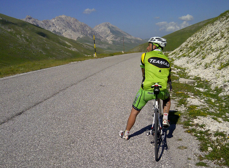 Dopo una lunga sosta (un'ora :o ) con panini e gelati, ripartivamo quindi io, Dankan e Gira per l'ascesa finale a Campo Imperatore; una salita divisa in due parti: la prima, fino a Fossa Paganica, molto pedalabile, tra il 5% e il 7%, la seconda, quella che porta al g.p.m. a quota mt. 2.130 s.l.m., molto più dura, soprattutto i 5 km. finali dove le pendenze sono sempre tra l'8% e il 12%.