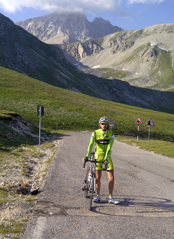 stamattina mentre mi riposavo cercando di alleviare il dolore della mia fastidiosissima contrattura mentre raccoglievo le patate :mrgreen: ripensavo ai posti e alle fotografie impresse nella mia mente.tutto è cominciato alle 5.15 di ieri quando la mia sveglia decideva di darmi due destri......ufff....ma chi me lo fa fare penso,e mentre lo dico una manata di acqua gelata si schianta sulla mia faccia e allora mi sveglio e ricordo quale è la missione di oggi,taaaanttaaaaa salita,e allora via,colazione,vestizione e...partenzazione :D raggiungo assergi passando sopra l'aquila e penso a tante cose belle e brutte ma questa è un'altra storia,arrivo all'appuntamento che mi ricorda l'ultima volta che siamo stati quà,esattamente un anno esatto,il mercoledì dopo la sportfull :o aspetto tutto il resto della compagnia compreso l'onniritardatario dankan :twisted: ;) e dopo i saluti e gli abbracci si parte per 2 km di discesa e subito prima sosta,random si deve spogliare :roll: riprendiamo per i circa 10-12 km in salita molto pedalabili e poi i due di discesa che ci portano al passo delle capannelle (altri bei ricordi) breve consulto.....(pipì :oops: ) e via in discesa di nuovo fino ad ortolano sosta fontanella e foto ricordo alla casetta di paolo,via direzione teramo ma......fino al bivio di prati di tivo...porca zozza salita di 18? km molto irregolare che ci porta di nuovo ai 1300 mt del piazzale con il gran sasso che si può toccare,panini,birretta,caffè e via percorso inverso,ma co i tanti km di salita pedalabile fino di nuovo al passo delle capannalle (e di nuovo sosta casetta di paolo complice la adiacente fontanella) poi i 2 km duri fino allo scollinamento prima dei 12 di discesa fino quasi alle macchine non prima dei 1700 mt duri per raggiungere il parcheggio,ma adesso mega sosta andrea prandi con l'amico direzione casa il capitano dopo un breve consulto con la sua bici decide di aspettarci all'ombra,robocop dopo la terza birra verso viterbo e noi tre poveri scemi rimasti soli per i 22,5 km di salita che ci separano da campo imperatore,il caldo si fà subito sentire e i 12,5 km più due di discesa fino al bivio sono un pò duretti pure perchè dopo 140 km e 3000 e passa metri di disl. con il pensiero di 10 km massacranti(che poi alla fine sono 4,5) non puoi fare una passeggiata ma impostiamo un passo lucignolata e saliamo ognuno del proprio passo,primo dankan poi io e poco dopo random che ha pagato il pezzo più duro ma pressappoco tutti insieme foto sorrisi complimenti e via verso le macchine per una bella doccia(da campo) e una bella cena sempre a sghignazzare di tutto e su tutti.