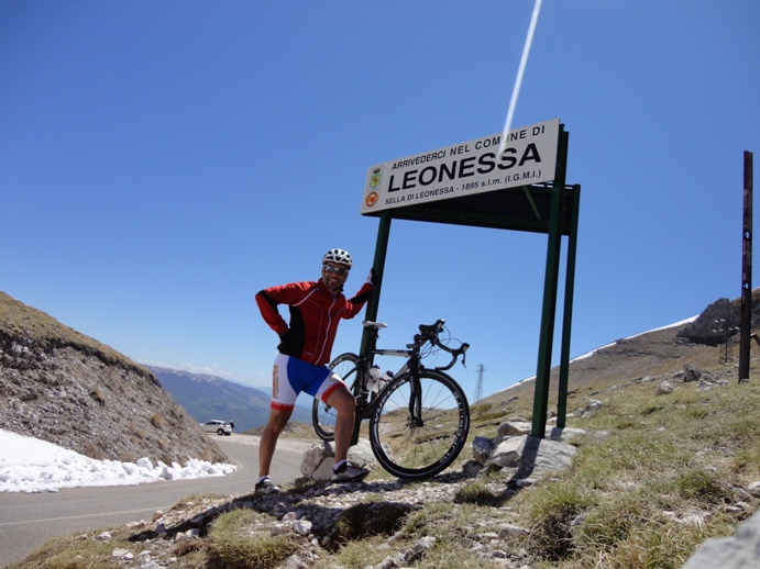 Lo so non lo dovevo fare Genera’!!! Ma la voglia era troppa, la giornata permetteva (neanche una nuvola), e era il mio giorno di riposo. Avevo voglia di fare la mia prima “impresetta” da principiante e allora ecco l’idea il mitico Terminillo in tutta la sua maestosità e soprattutto lunghezza :? ! Parto con la macchina, direzione Rieti e già il quadro a casa non si voleva accendere, la Punto mi guardava e diceva “ma nun starai a fa na cazzata???”.Non curante del consiglio da lei espressomi arrivo a Rieti poco prima del centro storico in un comodo parcheggio e lascio la macchina a riposo. Il tempo e’ meraviglioso e già dal parcheggio si vede la cima della montagna più alta del Lazio che domina su tutta Rieti con le sue vallate delimitate da piccole striscioline bianche! Mi dico:”mica sarà neve quella?”. Guardandolo questa volta e’ la mia coscienza che parla : “ma nun e’ che c’ha ragione la Punto?”. Basta pippe mentali mal che vada giro e torno indietro!!! Monto in sella e tutto sembra svanire! La felicità è troppa e lo stare li mi fa pensare a tutt’altro. Passo sopra il fiume velino (meraviglioso), continuo a salire e arrivo a Vazia.. beh.. tutto sommato pedalabile!! ma appena finito di pensarlo ecco “Lisciano” ed ecco la prima “alLisciata” :shock: !La strada da li comincia a salire per una pendenza del 9% piu’ o meno e non molla piu’ assestandosi su quella pendenza (con punte dell’11%) per 6 km fino ad arrivare a “Pian di Rosce” dove spiana (4%) vado su con cadenza lenta, in primis per non mandare il cuore su e secondo perchè sinceramente me la voglio godere senza uccidermi. Dopo Pian di Rosce la strada si rimette su quella pendenza 9%(sembra quasi che qualcuno prima di farla abbia deciso che la strada non debba avere strattonate :roll: e rimanere cosi sul pezzo), il tutto per altri 4/5 KM fino a Pian di Valli, arrivando così alle prime stazioni sciistiche di Campoforogna dove comincio a respirare l’aria della mia piccola impresa. E si perché più o meno so che sui 1600 metri ci dovrei stare e alla cima non manca molto e il duro più o meno è passato. La conifera lascia il posto al brullo e deserto paesaggio montano e il massiccio del Terminillo comincia a sorridermi :mrgreen: questa volta invece di terrorizzarmi :evil: . E’ la mia prima montagna con la M maiuscola e l’emozione funge più di carbone per locomotiva. Aumento il passo perché da li in poi tutto sembra più controllabile potendo vedere la strada sopra di te in che direzione va e quanto sale non essendoci un albero. Alberi no!!! ma neve ancora si!!! ci sono dei mucchietti qua e la che aumentano man mano che si sale!! Un rifugio sulla mia sinistra (non ricordo il nome) mi dice pero’ che sto per raggiungere la cima e le pedalate decollano perche’ la paura di mettere la bicicletta dall’altra direzione (discesa) e mollare e’ andata via. Arrivo alla sella di leonessa con il cuore a 150 e con 75 RPM. Ci sono riuscito!!! Non potevo condividere la mia gioia con nessuno se non con me stesso… ma e’ bastato e avanzato… Non c’era nessuno in cima se non una macchina parcheggiata con un alpinista che si stava preparando per un escursione. Ma li c’ero io!!! Ed era questa la cosa piu’ importante. Due foto da solo per immortalare il momento ma il vento fischiava (mortacci sua se fischiava) quindi mantellina pesante, cambio guanti con quelli invernali e si riparte in una discesa che hockenaim ie fa na p..pa hihihihihih... mai sotto i 60 km/h con punte di 80 Km/H strada perfetta!!! BELLOOOOOOOOOOOOOOOOOOOOOOOOOOOOOOOO. :o
