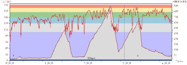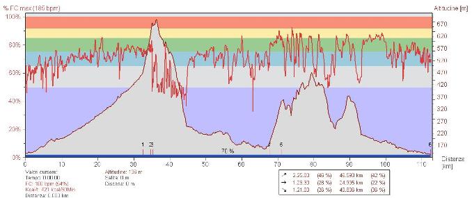 Nel complesso 107 km a 24Km/h, Disl. 1200m, FC 134/169, Cad. 87