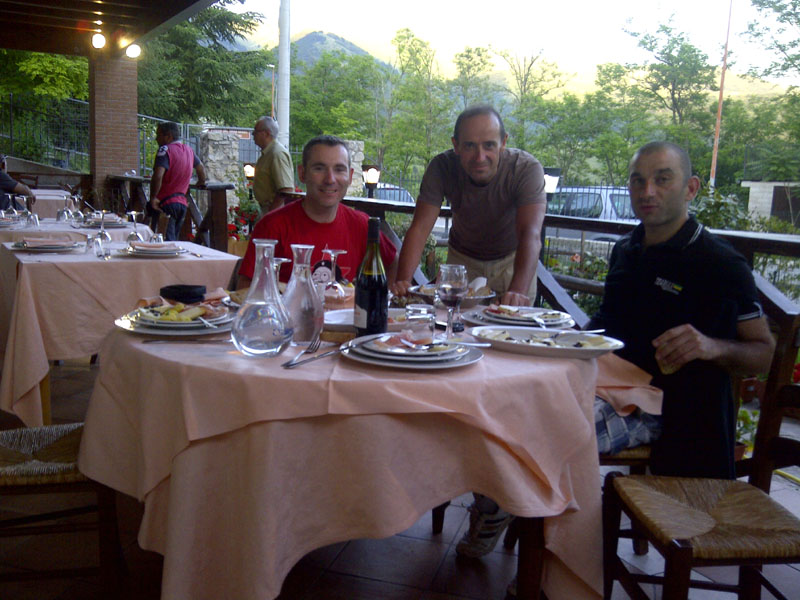 stamattina mentre mi riposavo cercando di alleviare il dolore della mia fastidiosissima contrattura mentre raccoglievo le patate :mrgreen: ripensavo ai posti e alle fotografie impresse nella mia mente.tutto è cominciato alle 5.15 di ieri quando la mia sveglia decideva di darmi due destri......ufff....ma chi me lo fa fare penso,e mentre lo dico una manata di acqua gelata si schianta sulla mia faccia e allora mi sveglio e ricordo quale è la missione di oggi,taaaanttaaaaa salita,e allora via,colazione,vestizione e...partenzazione :D raggiungo assergi passando sopra l'aquila e penso a tante cose belle e brutte ma questa è un'altra storia,arrivo all'appuntamento che mi ricorda l'ultima volta che siamo stati quà,esattamente un anno esatto,il mercoledì dopo la sportfull :o aspetto tutto il resto della compagnia compreso l'onniritardatario dankan :twisted: ;) e dopo i saluti e gli abbracci si parte per 2 km di discesa e subito prima sosta,random si deve spogliare :roll: riprendiamo per i circa 10-12 km in salita molto pedalabili e poi i due di discesa che ci portano al passo delle capannelle (altri bei ricordi) breve consulto.....(pipì :oops: ) e via in discesa di nuovo fino ad ortolano sosta fontanella e foto ricordo alla casetta di paolo,via direzione teramo ma......fino al bivio di prati di tivo...porca zozza salita di 18? km molto irregolare che ci porta di nuovo ai 1300 mt del piazzale con il gran sasso che si può toccare,panini,birretta,caffè e via percorso inverso,ma co i tanti km di salita pedalabile fino di nuovo al passo delle capannalle (e di nuovo sosta casetta di paolo complice la adiacente fontanella) poi i 2 km duri fino allo scollinamento prima dei 12 di discesa fino quasi alle macchine non prima dei 1700 mt duri per raggiungere il parcheggio,ma adesso mega sosta andrea prandi con l'amico direzione casa il capitano dopo un breve consulto con la sua bici decide di aspettarci all'ombra,robocop dopo la terza birra verso viterbo e noi tre poveri scemi rimasti soli per i 22,5 km di salita che ci separano da campo imperatore,il caldo si fà subito sentire e i 12,5 km più due di discesa fino al bivio sono un pò duretti pure perchè dopo 140 km e 3000 e passa metri di disl. con il pensiero di 10 km massacranti(che poi alla fine sono 4,5) non puoi fare una passeggiata ma impostiamo un passo lucignolata e saliamo ognuno del proprio passo,primo dankan poi io e poco dopo random che ha pagato il pezzo più duro ma pressappoco tutti insieme foto sorrisi complimenti e via verso le macchine per una bella doccia(da campo) e una bella cena sempre a sghignazzare di tutto e su tutti.