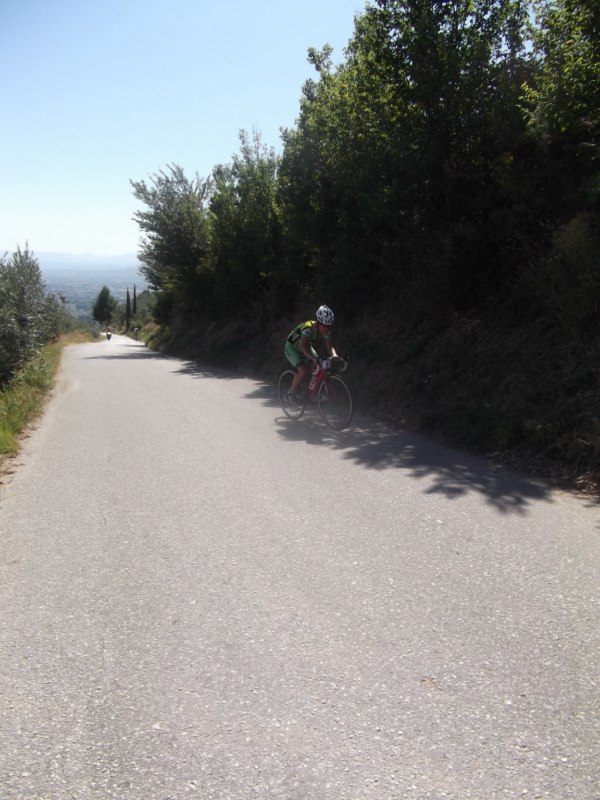 A cipo, rispondo, ma come corro? Qua me spellano gli autovelox e comunque non potrei, sta terra umbra è zeppa di gente che passeggia, degusta, scopre, intasa, insomma, quanti vacanzieri ancora in giro!!! AHHHHRg. non arriverò mai per l'una e mezza, e invece....uscita Spello alle 13.15, arrivo là e c'ho pure tempo di una toilette, una bevuta d'acqua e un riscaldamento veloce di circa 15 minuti. :oops: :oops: :oops: aiutoooo! Tossisco ancora, bronchi chiusi, ma volevo stare qua in mezzo, di fermarmi questa settimana non mi andava e l'ho dovuto fare, e cacchio almeno sabato sto in mezzo al tran tran ciclistico, seppure per gioco. Alle 14.00 spaccate parto, vedo cipo che si sbraccia e le sorrido, alex non me lo vuole dire dove sta :mrgreen: e infatti lo ritrovo sul percorso....Cipo saluta tutti, parla co tutti, mezza spello la chiama, se fa far le foto da tutti, cavolo è un personaggio! Parto, non soffro all'inizio, -6km, -5km, -4km, taaaac, cominicia a ballare il samba mi corazon, 178, 180,185 battiti, 186,187 eccheccachio, c'ho i polmoni chiusi da la freddata de piacenza e tu ti alzi e balli e mi togli ancora un pò di fiato....ufff....sulla salita di collepino i garmin di chi mi è testimone segnavano 38 gradi, terribile, vedo alex e gli dico, sto boccheggiando meno male che c'è lui, se me pia un coccolone almeno quaLCUNO me raccoglie :o ..proseguo sempre più cauta, voglio abbassare il cuore, arriva da dietro Roberta-siluro e mi passa, anche se di circa tre metri, la tengo a vista davanti e le grido vai! vai! Vai!, al meno 1km c'è la svolta a sinistra, collepino si vede stiamo arrivando, -500mt, -300mt, parto con uno scatto e pago, roberta si dosa e mi stacca in volata di una bella manciata di secondi, io arrivo, mollo la bici e mi rinfresco all'ombra....due bicchieri di sali, due boccette d'acqua, una addosso, una intera bevuta. Che esperienza! Bella! Sono contenta di esserci stata, i nipotini di cipo, Cipo in giallo che non sta nella pelle, alex fotografo e tifoso e in formissima dopo l'otztaler.