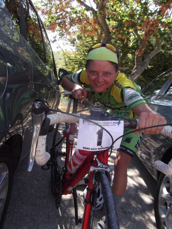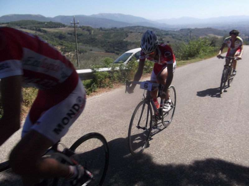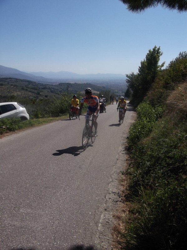 A cipo, rispondo, ma come corro? Qua me spellano gli autovelox e comunque non potrei, sta terra umbra è zeppa di gente che passeggia, degusta, scopre, intasa, insomma, quanti vacanzieri ancora in giro!!! AHHHHRg. non arriverò mai per l'una e mezza, e invece....uscita Spello alle 13.15, arrivo là e c'ho pure tempo di una toilette, una bevuta d'acqua e un riscaldamento veloce di circa 15 minuti. :oops: :oops: :oops: aiutoooo! Tossisco ancora, bronchi chiusi, ma volevo stare qua in mezzo, di fermarmi questa settimana non mi andava e l'ho dovuto fare, e cacchio almeno sabato sto in mezzo al tran tran ciclistico, seppure per gioco. Alle 14.00 spaccate parto, vedo cipo che si sbraccia e le sorrido, alex non me lo vuole dire dove sta :mrgreen: e infatti lo ritrovo sul percorso....Cipo saluta tutti, parla co tutti, mezza spello la chiama, se fa far le foto da tutti, cavolo è un personaggio! Parto, non soffro all'inizio, -6km, -5km, -4km, taaaac, cominicia a ballare il samba mi corazon, 178, 180,185 battiti, 186,187 eccheccachio, c'ho i polmoni chiusi da la freddata de piacenza e tu ti alzi e balli e mi togli ancora un pò di fiato....ufff....sulla salita di collepino i garmin di chi mi è testimone segnavano 38 gradi, terribile, vedo alex e gli dico, sto boccheggiando meno male che c'è lui, se me pia un coccolone almeno quaLCUNO me raccoglie :o ..proseguo sempre più cauta, voglio abbassare il cuore, arriva da dietro Roberta-siluro e mi passa, anche se di circa tre metri, la tengo a vista davanti e le grido vai! vai! Vai!, al meno 1km c'è la svolta a sinistra, collepino si vede stiamo arrivando, -500mt, -300mt, parto con uno scatto e pago, roberta si dosa e mi stacca in volata di una bella manciata di secondi, io arrivo, mollo la bici e mi rinfresco all'ombra....due bicchieri di sali, due boccette d'acqua, una addosso, una intera bevuta. Che esperienza! Bella! Sono contenta di esserci stata, i nipotini di cipo, Cipo in giallo che non sta nella pelle, alex fotografo e tifoso e in formissima dopo l'otztaler.