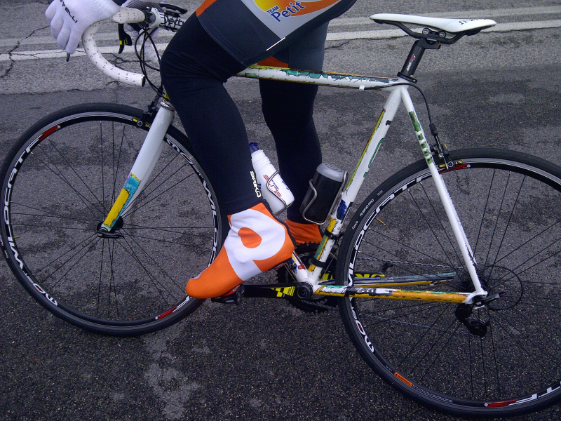 Tornando a quel "pezzo di ferro pieno di colori" che hai foografato....non vedo l'ora di completare il mezzo con delle ruote adeguate (chi si fa delle ruote con i mozzi, i cerchi e i raggi che vuole al giorno d'oggi è considerato una specie di marziano....diciamo che è molto più comodo comprare delle ruote "belleffatte"); ringrazio pubblicamente gli amici del negozio Pedalando Bike Shop per avermi prestato delle ruote nuove con cui correre.