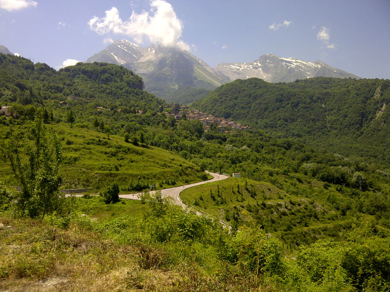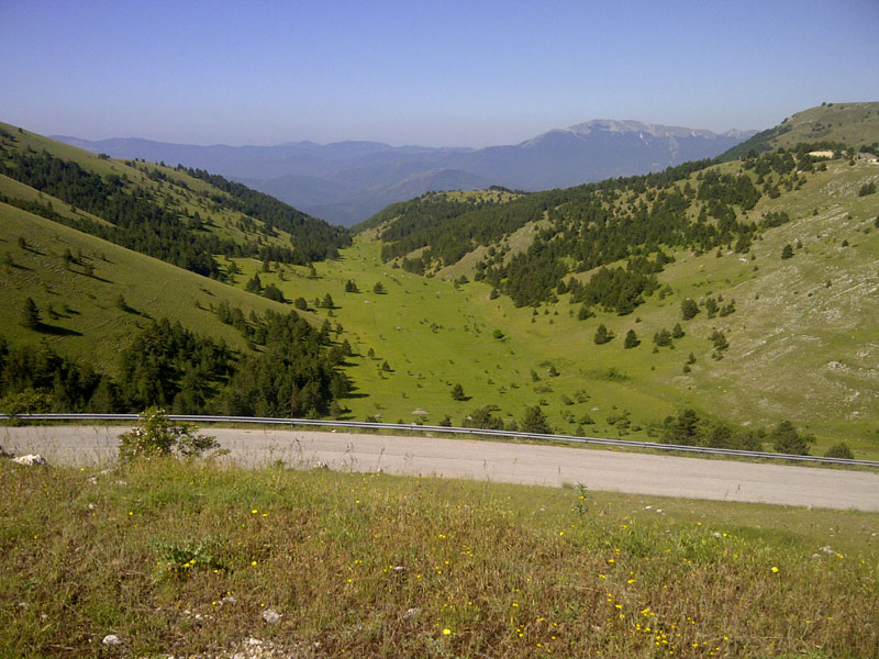 Si parte e, dopo 2 km. di discesa, è già salita :mrgreen: ... una lunga ma pedalabile salita, di quasi 15 km., che ci conduce al valico di S. Pietro; pedaliamo quasi tutti insieme; "quasi" perché il Capitano mette il frullino d'ordinanza e scompare all'orizzonte :shock: ; dal valico ci buttiamo in discesa per raggiungere la strada della Val Vomano confluendo esattamente al Passo Capannelle.