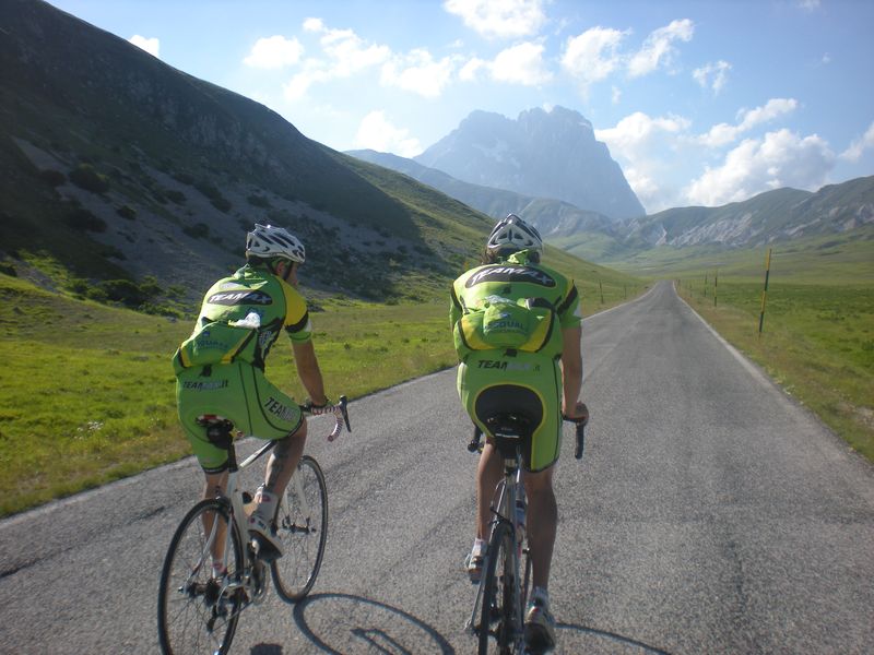 stamattina mentre mi riposavo cercando di alleviare il dolore della mia fastidiosissima contrattura mentre raccoglievo le patate :mrgreen: ripensavo ai posti e alle fotografie impresse nella mia mente.tutto è cominciato alle 5.15 di ieri quando la mia sveglia decideva di darmi due destri......ufff....ma chi me lo fa fare penso,e mentre lo dico una manata di acqua gelata si schianta sulla mia faccia e allora mi sveglio e ricordo quale è la missione di oggi,taaaanttaaaaa salita,e allora via,colazione,vestizione e...partenzazione :D raggiungo assergi passando sopra l'aquila e penso a tante cose belle e brutte ma questa è un'altra storia,arrivo all'appuntamento che mi ricorda l'ultima volta che siamo stati quà,esattamente un anno esatto,il mercoledì dopo la sportfull :o aspetto tutto il resto della compagnia compreso l'onniritardatario dankan :twisted: ;) e dopo i saluti e gli abbracci si parte per 2 km di discesa e subito prima sosta,random si deve spogliare :roll: riprendiamo per i circa 10-12 km in salita molto pedalabili e poi i due di discesa che ci portano al passo delle capannelle (altri bei ricordi) breve consulto.....(pipì :oops: ) e via in discesa di nuovo fino ad ortolano sosta fontanella e foto ricordo alla casetta di paolo,via direzione teramo ma......fino al bivio di prati di tivo...porca zozza salita di 18? km molto irregolare che ci porta di nuovo ai 1300 mt del piazzale con il gran sasso che si può toccare,panini,birretta,caffè e via percorso inverso,ma co i tanti km di salita pedalabile fino di nuovo al passo delle capannalle (e di nuovo sosta casetta di paolo complice la adiacente fontanella) poi i 2 km duri fino allo scollinamento prima dei 12 di discesa fino quasi alle macchine non prima dei 1700 mt duri per raggiungere il parcheggio,ma adesso mega sosta andrea prandi con l'amico direzione casa il capitano dopo un breve consulto con la sua bici decide di aspettarci all'ombra,robocop dopo la terza birra verso viterbo e noi tre poveri scemi rimasti soli per i 22,5 km di salita che ci separano da campo imperatore,il caldo si fà subito sentire e i 12,5 km più due di discesa fino al bivio sono un pò duretti pure perchè dopo 140 km e 3000 e passa metri di disl. con il pensiero di 10 km massacranti(che poi alla fine sono 4,5) non puoi fare una passeggiata ma impostiamo un passo lucignolata e saliamo ognuno del proprio passo,primo dankan poi io e poco dopo random che ha pagato il pezzo più duro ma pressappoco tutti insieme foto sorrisi complimenti e via verso le macchine per una bella doccia(da campo) e una bella cena sempre a sghignazzare di tutto e su tutti.