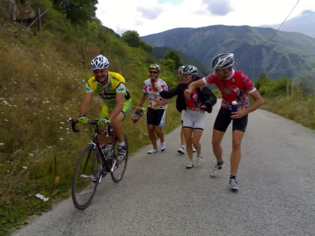 Tutti ad incitarlo con relativo rinfrescamento con le borracce a mo di tappone al tour, quando i veri prof