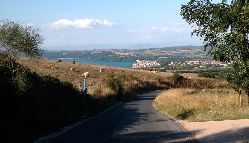 Sono andato ad Anguillara, arrivandoci in discesa da "via dei monti", meglio nota come "croce di ferro", una salita che, dal versante di Vigna di Valle che ho preso ieri, presenta un bello strappetto al 12% 8-) . Allo scollinamento, mi si presentava un bellissimo panorama di Anguillara, con il sole già basso che "scaldava" i colori e con le mucche al pascolo; ho scattato una foto con il telefonino e la allego qui sotto.