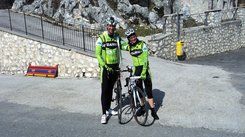 Siamo partiti alle 8.30 da Castel Madama dopo un primo tratto in pianura , cominciamo a salire e NON ABBIAMO MAI SMESSO DI FARLO :shock: :shock: :shock: :shock: :D per il passo della fortuna, per poi risalire a Pisoniano fino a San Vito, proseguiamo verso un tratto in pianura fino a Bellegra e da qui una bella discesa nel bosco con ZERO MACCHINE E UN BUON ASFALTO :D e la mia Cri si beava di questo.... e poi di nuovo in salita verso Rocca Santo Stefano direzione Gerano e mò???? :o incontriamo un biker con la sua cannondale che ci saluta e ci parla di una bella salita con delle impettate mostruose , certo con la bici da strada è dura senza rampichino , ma i ciclisti tosti con la bici da strada la fanno :roll: :roll: , parte la sfida, ma si ma dai e lui ci segue , ragazzi sembrava un piccolo Mortirolo alcuni tratti al 23% con 35 / 37 rpm , meno male che in alcuni punti spianava , ma l'ultimo tratto di quasi un km fisso al 19 20% CHE SPETTACOLO NON SI MOLLA NO CHE NON SI MOLLA EDDAJEEEEEEEEEE, scolliniamo e arriviamo a Canterano ma il Biker ci dice arrivati sino a qui a questo punto non potete non arrivare su alla Rocca , bene ho detto , sarà il nostro GPM :D la nostra Cima Coppi . Arrivati li la sorpresa era un bel PAVE' di circa 1 km fisso al 18% e NO CHE NON SI MOLLA , che bello affrontare queste RAMPETTATE se le affronti con la pedalata giusta arrivi sino in cima ;) e allora eccola la nostra rocca a 834 metri spettacolare c'era anche Padre Pio GIURO CHE L'HO VISTO :D :D e li che è scattata la foto tutti insieme anche con la moglie del biker che ci stava aspettando in cima e tutti i nostri complimenti.