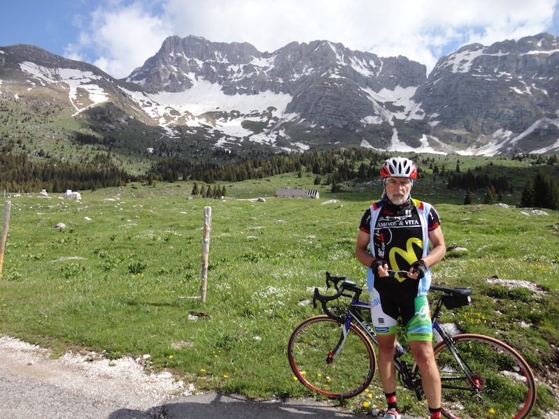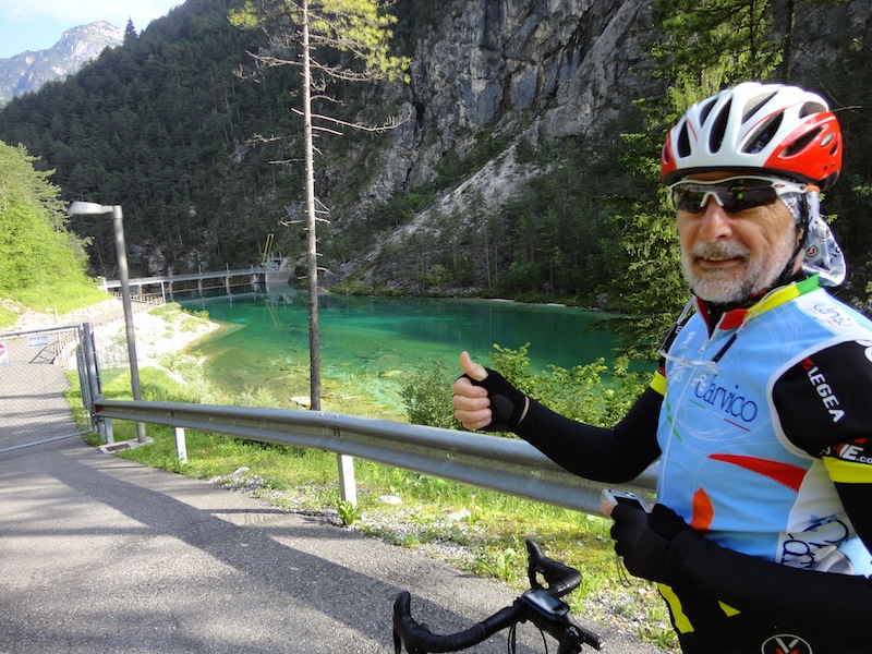 Una giornata mozzafiato per il binomio Carnico-Dancelli… Studiata a tavolino ed eseguita nella migliore delle maniere dall'inizio alla fine! Si parte in macchina verso Chiusaforte si parcheggia e via subito sulla salita che porta a Sella Nevea costeggiando la Raccolana un fiume dalle acque incredibilmente smeraldo al punto di doversi per forza fermare ed immortalare più volte! ma veniamo a noi! Ma più che altro a Pino che anche oggi mi ha emozionato! Era la salita che avevo studiato per lui.. che parte dapprima leggera poi alza su qualche tratto anche al 12 ma solo per poco… il resto era un sinuoso andare 7%… 8%…10%.. poi di nuovo 7% e così via per 19 km attraverso ad un incanto che solo il fotoracconto che pubblicherò al mio rientro, potrà (in parte) descrivere che cos'e' questa meravigliosa salita vinta da Uran Uran lo scorso anno… al 19mo km infatti diventa brutale.. nervosa… incredibilmente mossa.. con rettifili e tornanti dove si sgomma quasi per le pendenze che non scendono mai sotto il 16 fino ad arrivare al 20% .. Bellissima… Li volevo vedere il grande Pino.. la prova del nove di questo meraviglioso allenamento che ha fatto in questi 8 giorni… arrivando qui dopo non aver toccato la bici per 15 giorni!!! Ed eccola li!!! la Zampata del vecchio volpone.. Dancelli si beve gli ultimi 3 km alla grande conquistando l'altopiano del Montasio (dove nasce l'omonimo formaggio) e sfilando sopra tutti gli slogan più belli dello scorso Giro.. Dopo di che si ritorna verso Sella Nevea e si scende per puntare il meraviglioso Lago del Predil.. li la sosta caffè.. dove saggiamente insieme decidevamo di dividerci. Pino di nuovo Sella Nevea (altri mt di dislivello) e giù in discesa fino a chiusaforte dove una calda macchina lo aspettava con la borsa dei vestiti ed io….. DIREZIONE SLOVENIA :mrgreen: