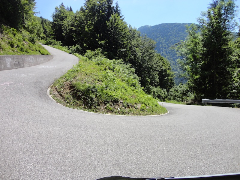 Dal lago svolta a destra e via verso il confine!!! A dividerlo un Sella… Sella Predil 1150 mt SLM.. raggiungibile mediante una salita regolare con 4 bellissimi tornanti dove si poteva ammirare il Lago sempre più dall'alto.. eco il cartello (slovenia) con la vecchia frontiera.. di li in poi tutto cambia… scritte segnaletiche costruzioni in pietra bianca con tetti spioventi.. un autentico spettacolo.. ma ill bello deve ancora venire… dopo 1 km 2 forse ecco il bivio a sinistra IL MANGART.. una leggenda qui in Friuli anche se in territorio straniero! Ma effettivamente una delle più' belle salite che io abbia mai fatto. Il cartello mi fa capire che e' un passo chiuso.. mmmmmmmm…. speriamo bene!!