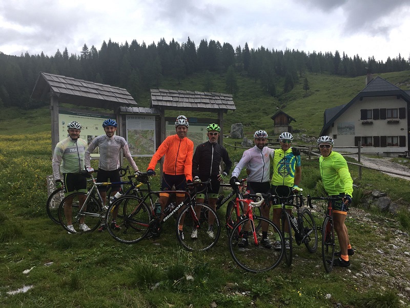 Oggi giornata tosta! In 8 siamo partiti per il solito avvicinamento in auto verso il Campo Base di Resiutta. Ma non per tutti. Il Prof, infatti, con una mossa che si è rilevata provvidenziale, ha proseguito l’avvicinamento in auto fino al lago Predil per tentare la scalata secca alla vetta. Per noi, Risalire la Raccolana sotto il sole è stato, come sempre, magico ma in montagna, si sà, il meteo cambia rapidamente e una volta a Sella Nevea, le prime avvisaglie di brutto tempo ci hanno costretto ad una bella sosta bar con tanto di cornetti, cappuccini, e torta sacher. Ripartiti speranzosi e senza pioggia, siamo ridiscesi verso il lago Predil, dove ci siamo ricongiunti con il Prof e, dopo aver superato tutti insieme, di slancio, il Passo Predil, abbiamo attaccato compatti gli 11,4 km della salita del Mangart. Subito, io e Michele, approfittando di un meteo fino ad allora di nuovo caldo ed asciutto, pedalando di buona lena, ci siamo avvantaggiati sul resto della comitiva, mente Emiliano è rimasto a coccolare il resto del Gruppo. Oggi ho avuto al mio fianco, per tutta la salita, Michele che si dimostra, ogni giorno di più, un abile scalatore. A 2 Km dalla vetta il meteo è peggiorato rapidamente ed il vento, la pioggia e la bassa temperatura ci hanno aggrediti provando a respingerci ma noi, oramai in vista della vetta abbiamo accelerato fino alla conquista della cima di giornata. Bravo Michele!! Dopo aver indossato velocemente la mantellina e fatto un selfie per documentare l’impresa, io e Michele abbiamo iniziato tosto a ridiscendere sotto la tormenta !! Dopo 4 km di discesa difficile ma prudente, abbiamo incontrato il Prof che, nel frattempo, si era dovuto fermare sotto una galleria nonostante l’estremo tentativo di raggiungere la vetta. Peccato, si rifarà certamente la prossima volta. In tre (io Michele ed il Prof) abbiamo proseguito la discesa sotto un freddo pungente e la strada viscida. Una volta a Valle abbiamo raggiunto di nuovo il Lago Predil da dove la provvidenziale mossa del Prof ci ha consentito di fare un comodo ed asciutto ritorno in auto fino a Resiutta dove abbiamo ritrovato il resto della comitiva la quale, viste le avvisaglie di maltempo, aveva mollato la salita del Mangart dopo 5 Km facendo ritorno al campo base. Birra, pollo e patatine per tutti ed un’altra giornata da ricordare.