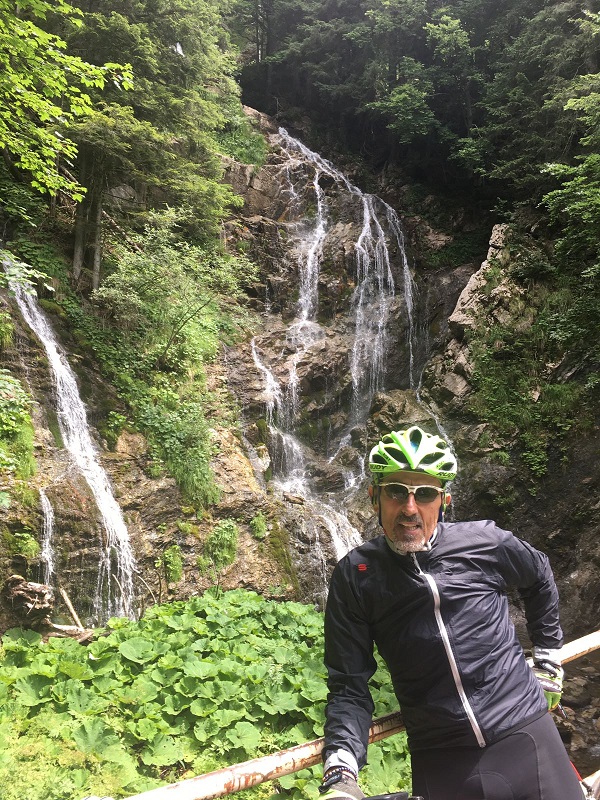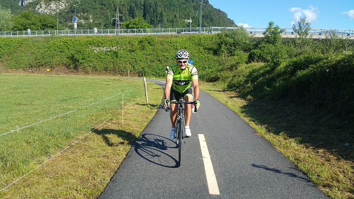 Non era chiaro quale fosse il giro. Il meteo incerto consigliava di girare intorno senza allontanarsi troppo e noi siamo rimasti a letto qualche minuto di troppo. Morale, la compagnia se ne va e io e Michele usciamo senza una meta ma con un pensiero fisso, inconfessato l’uno all’altro ! ! . Stranamente le bici si dirigono a nord, verso l’Austria, e dopo pochi km il pensiero fisso scarta a sinistra e vediamo il cartello ‘Monte Zoncolan!!! Un’occhiata muta e ci siamo trovati subito in salita. E’ il versante più facile dei tre ma sempre catalogata come salita ‘Hors Categorie’, 13,3 Km all’8,7% medio !!!! Saliamo di buon passo per i primi 10 km con lo stambecco-Michi che conta la distanza dalla vetta facendo affidamento sulla segnaletica stradale che recita: Zoncolan 10 Km. Peccato che dopo l’abitato di Zoncolan comincino i terribili ultimi 3 Km fino alla sella, con pendenze che arrivano oltre il 20% !!!!!. Fatica allo stato puro. Le gambe non girano per inerzia ed ogni pedalata te la devi conquistare con il cuore i muscoli, la testa!!! Ad un km dalla vetta ci passa una specie di ‘criceto’ quasi invisibile, senza casco e che si rivolge a noi in inglese per sapere quanto mancasse alla vetta. Gli dico che manca 1Km e lui subito sparisce, bofonchiando qualcosa che non ho capito !!! Noi stringiamo i denti e conquistiamo la vetta tenendoci per mano (che ve lo dico a fa!!!). Scendiamo dalla bici e ritroviamo il ‘criceto’ che in realtà si chiama Andrew Brannan, ha 53 anni, abita a Swansea nel Galles e si affretta a ringraziarmi (di che?) ed a chiedermi l’amicizia su Strava (per la cronaca, è ridisceso a Sutrio, ha scavallato Ravascletto e si è rifatto lo Zoncolan pure da Ovaro!!!! ). Ora siamo amici su Strava!!. Dopo essere tornati a Sutrio, ci siamo fermati per un caffè con l’intenzione di tornarcene in albergo, paghi dell’impresa. Squilla il Telefono! E’ il Prof che, lasciata la compagnia, si è ritrovato, da solo, in cima a una qualche salita che nemmeno lui sa come ci è arrivato ma è ansioso di comunicarci che si trova in un posto stupendo e che dobbiamo raggiungerlo!!!! Ma porc…!!!! Totale, altri 30 Km e 700 mt di salita e poi, in tre, come ci capita spesso da qualche tempo (!) facciamo ritorno ad Arta Terme giusto in tempo per evitare il diluvio universale !!!!!!