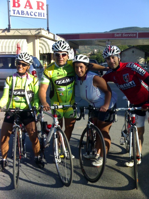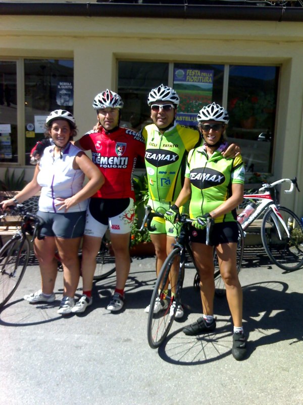 Questa mattina alle ore 8,30 appuntamento a Norcia ,con me Barby,Marco,Alex e Laura loro venuti da Foligno.La temperatura e la giornata sono stati bellissimi la compagnia neanche a parlarne.Prendevamo il bivio per Castelluccio appena fuori Norcia ed iniziava subito la salita lunga ma pedalabile ( 20 KM.)Andatura piacevole e paesaggio unico , arrivavamo al passo e giù verso la piana di Castelluccio arrivati alla meta colazione offerta da Laura foto quattro chiacchiere e poi si decideva di ritornare ,affrontavamo la salita per uscire da Castelluccio che presentava una pendenza massima del 17% e gli ultimi km.mai sotto al dieci ,fortunatamente era solo di 5km.Ma il panorama che si poteva osservare era veramente bellissimo.Poi lunga discesa che ci riportava a Norcia con una 60 di km.fatti.Venerdì si replica con la stessa compagnia dalla parte ,però, di Visso e altre salite conosciute da Alex e Laura.