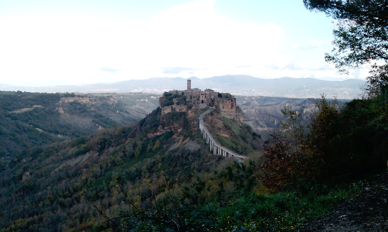 A Bagnoregio Paolo/John Belushi offriva la pizza :P (grazie); poi scendevamo al ponte che raggiunge Civita di Bagnoregio; per chi non la conoscesse: si tratta di uno dei luoghi più suggestivi del centro Italia; la chiamano "la città che muore" :? , perché non è altro che un gruppo di case arroccate su una roccia di tufo che ancora (fino a quando?) sopravvive nonostante la zona tutta intorno sia stata completamente erosa nel tempo :shock: (vedere la foto che ho scattato ieri, qui sotto allegata); a vederla dal vivo, ricorda un po' quel gioco che facevamo da piccoli in spiaggia, quando piantavamo il bastoncino del gelato su un mucchio di sabbia e, a turno, scavavamo intorno e chi faceva cadere il bastoncino perdeva...