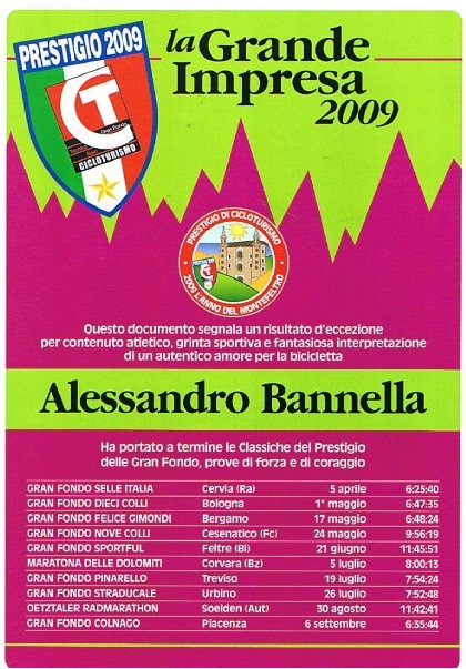 UFFICIALIZZATO IL PRESTIGIO 2010 DI CICLOTURISMO ecco le tappe: 11/04 - GF Selle Italia 25/04 - La Felice Gimondi 01/05 - Dieci Colli Bolognesi 23/05 - Nove Colli - 9 Colli 20/06 - GF Sportful 04/07 - GF Fausto Coppi 04/07 - Maratona dles Dolomites 1...8/07 - GF Pinarello 08/08 - GF Charly Gaul 29/08 - Oetztaler Radmarathon 05/09 - GF Colnago